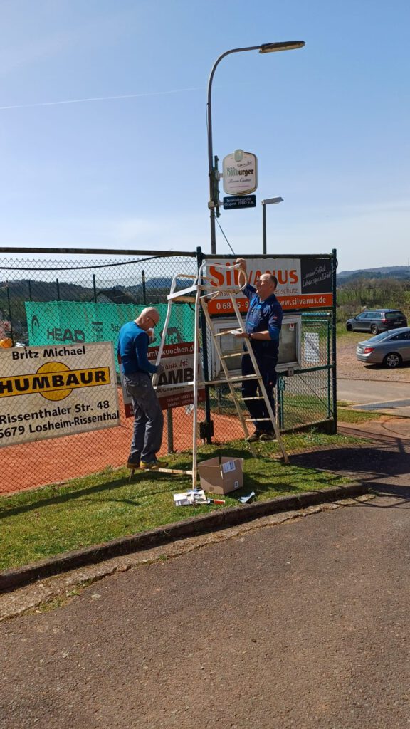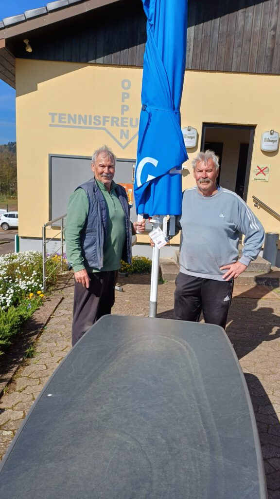 Bild oben zeigt den 1. Vorsitzenden Matthias Klauck (links) neben seinem Zwillings-Bruder Nico Klauck bei der Aufstellung der Sonnenschirme sowie der Tische auf der Terrasse des Oppener Tennis-Clubs!